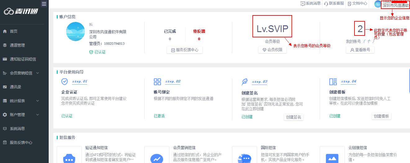 5、账号绑定完成后,即可按操作说明进行模板管理,签名管理及短信发送各功能,详细操作步骤见“文档中心”--“功能说明”