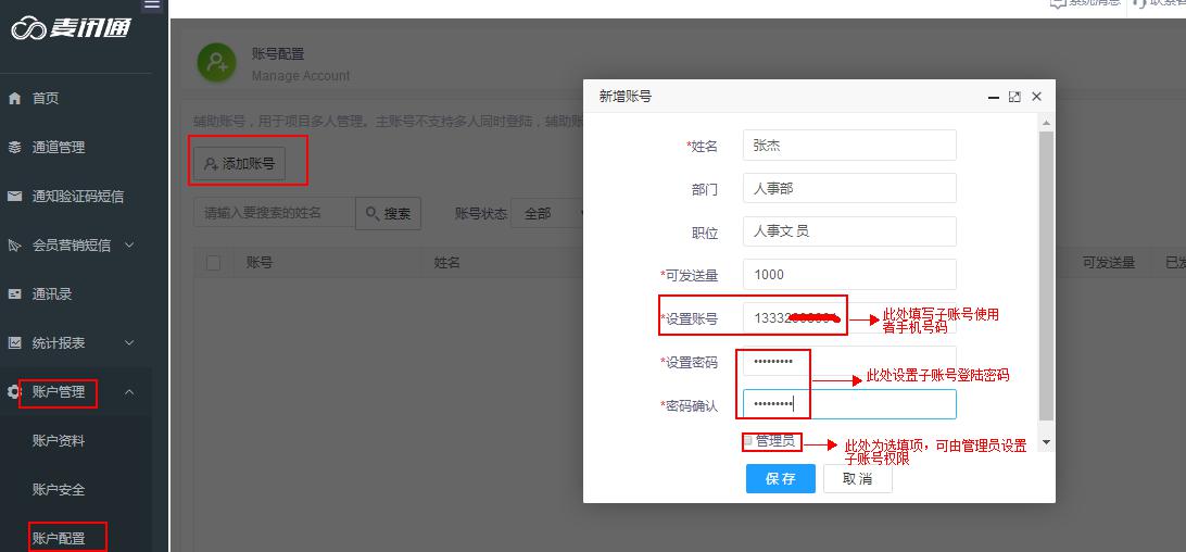 四、企业用户子账号的设立:有多人使用需求时,可下设企业子账号分配给企业内部使用。路径:账号管理--账号配置--添加账号--新增账号。