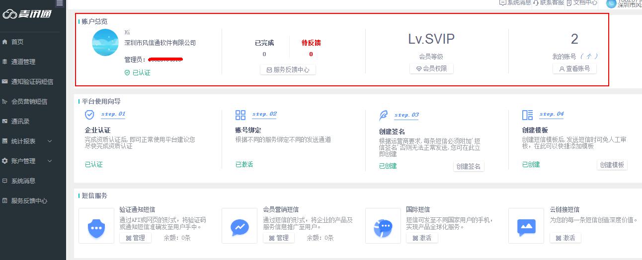 2、短信余量:可实时查看到帐户内的短信余量,当余量较少时可在线联系客户或点击充值获取银行信息,转款后将截图发送给客服退会增加相应短信量。