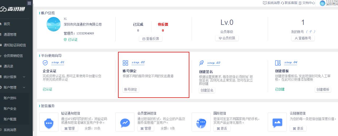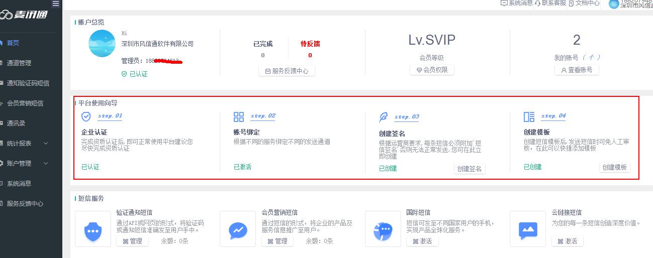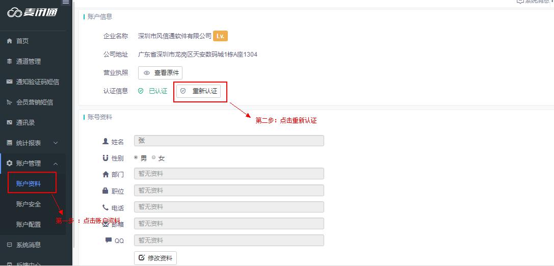 1、企业认证:根据运营商要求,企业需要完成认证方可开通短信业务,如需重新认证,请前往“账户管理”--账户资料