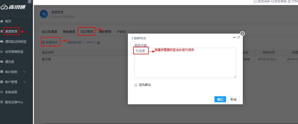 3、创建签名:在能力管理项目下创建签名。因运营商要求,所有短信用户必须在短信内置签名。签名在短信中将会被【】方头括号进行标记。创建签名路径:能力管理--签名管理--新建签名